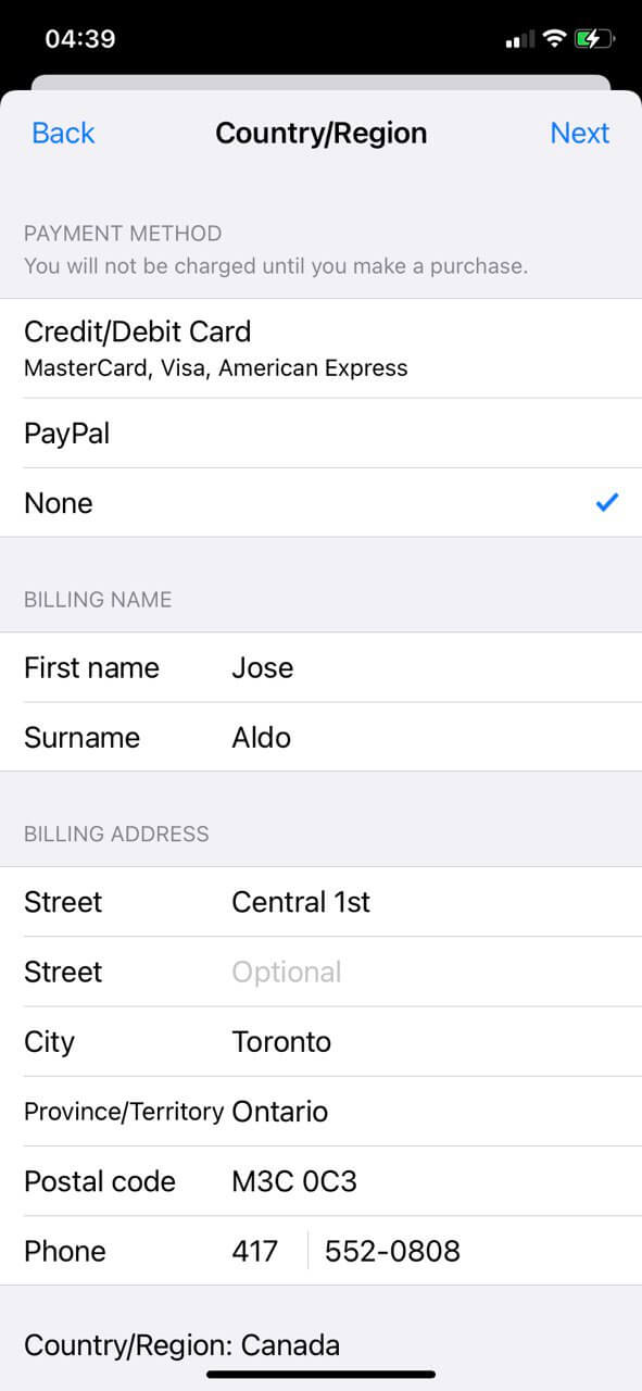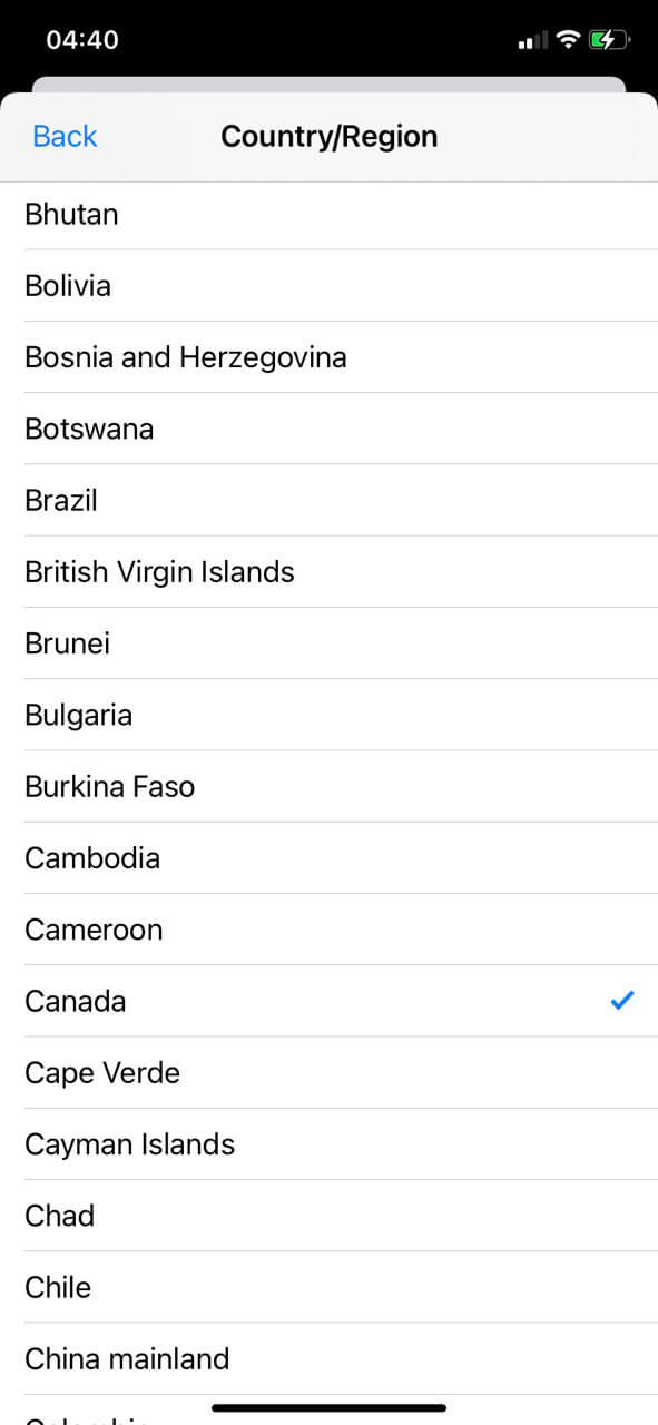 Selecciona "Canadá" en la lista de países
